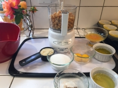 Puree the chickpeas, oil, juices and zests, egg yolks until smooth. Add sifted ingredients (flour, baking powder, salt, cardamom) to the chickpeas, stir. Then add ground almonds. Next, you are supposed to whisk the egg whites until they form soft peaks and fold into the batter. (I forgot that part, oops!) scoop batter into muffin papers and top with additional sugar, ground almonds and cardamom. Bake at 325 degrees for 12-13 minutes or until toothpick comes out clean. Mine took longer, and I am wondering if this was written for a convection oven.